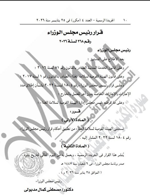 ونص القرار على استثناء الهيئة القومية لسلامة الغذاء من أحكام قرار رئيس مجلس الوزراء رقم 180 لسنة 2023، الخاص بتنظيم الإعارات والإجازات بدون أجر للعاملين خارج البلاد.