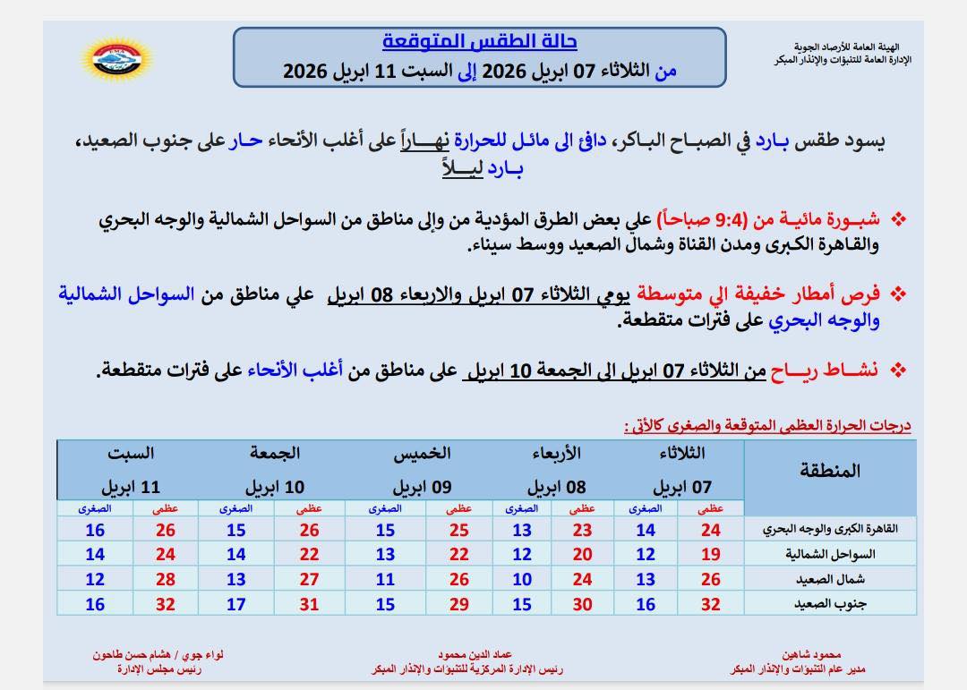 حالة الطقس المتوقعة من الثلاثاء 07 ابريل 2026 الى السبت 11 ابريل 2026