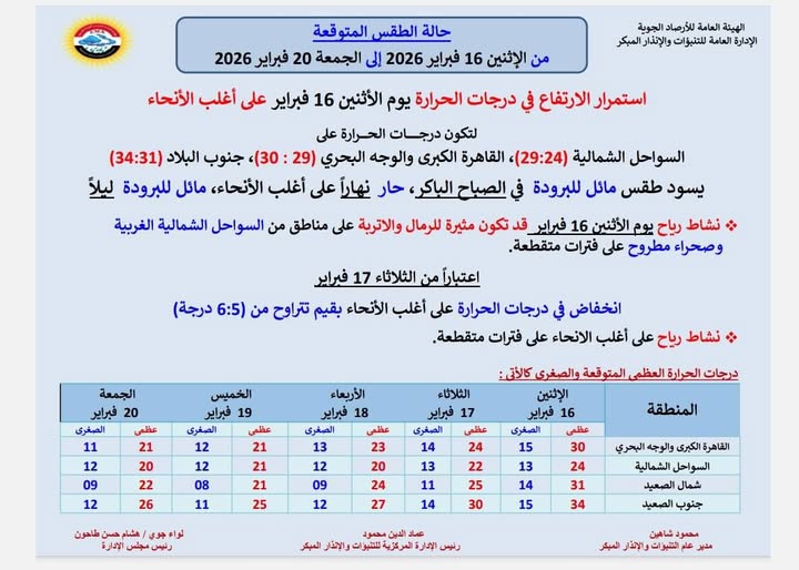 حالة الطقس المتوقعة من الاثنين 16 فبراير 2026 الى الجمعة 20 فبراير 2026